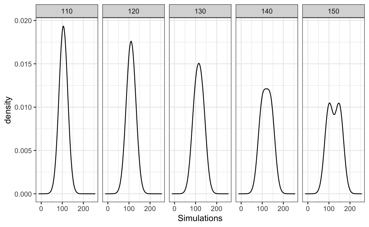 You can see the abstract mixture distributions below where I vary the mean of the second category. Note, these distributions represent the populations, not samples, as they use huge sizes.2 As can be seen in the plot below, the abstract mixture distribution shows bimodality only when the means are sufficiently far apart. Visually, this appears when Mean2=150, when the difference in the means is 50. Note, this is more than twice the standard deviation (20), as expected as per the inequality above.